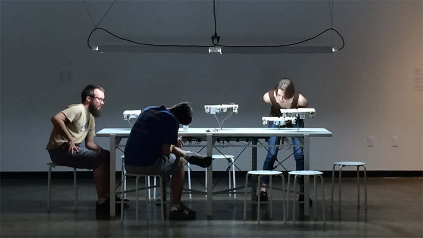 Kinetic sculpture of string, sewing needles, and motors
