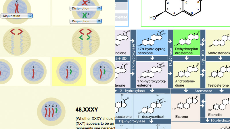 The Steroidogenesis Game shows how steroid hormones, like estrogen and testosterone, are synthesized from cholesterol by enzymes. Starting from a cholesterol molecule, the player selects several enzymes that alter the molecule, ultimately creating a steroid hormone. The availability of these enzymes determine how much, if any, of a certain hormone an individual produces. Some conditions considered "intersex" include people who, for instance, have "male" XY chromosomes, but have less of the enzyme necessary to produce testosterone.